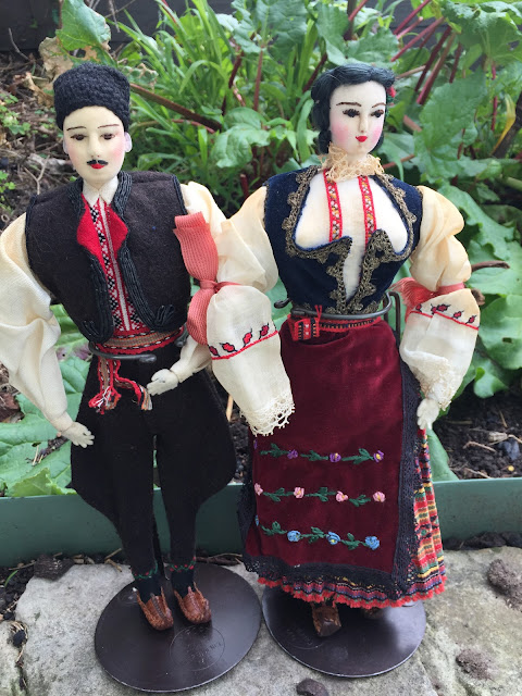 I have discussed the folk costume from Sumadija several times before on the blog ( Serbian dolls,Serbian dolls) and these two are very well made examples of it. As always the female's apron is a stand out, here it is a deep burgundy velvet with 3 rows of hand stitched flowers. The male costume is also enhanced here with the hand embroidered detail on the shirt front.